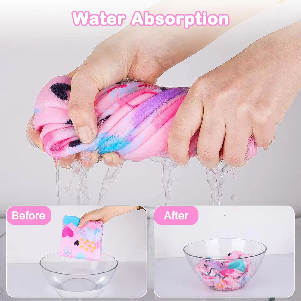 Soft, absorbent, and patterned with colorful hearts, hair towels are the best at speeding up drying time. They absorbant material works wonders soaking up water.